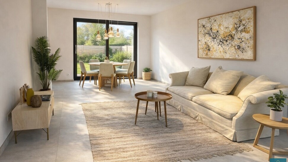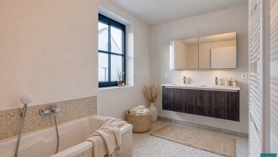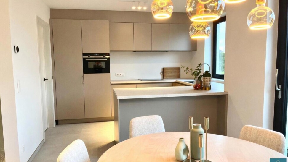 Deze energiezuinige woning is uitgerust met een warmtepomp, vloerverwarming en zonnepanelen en behaalt een uitzonderlijk gunstig E-peil van E7.