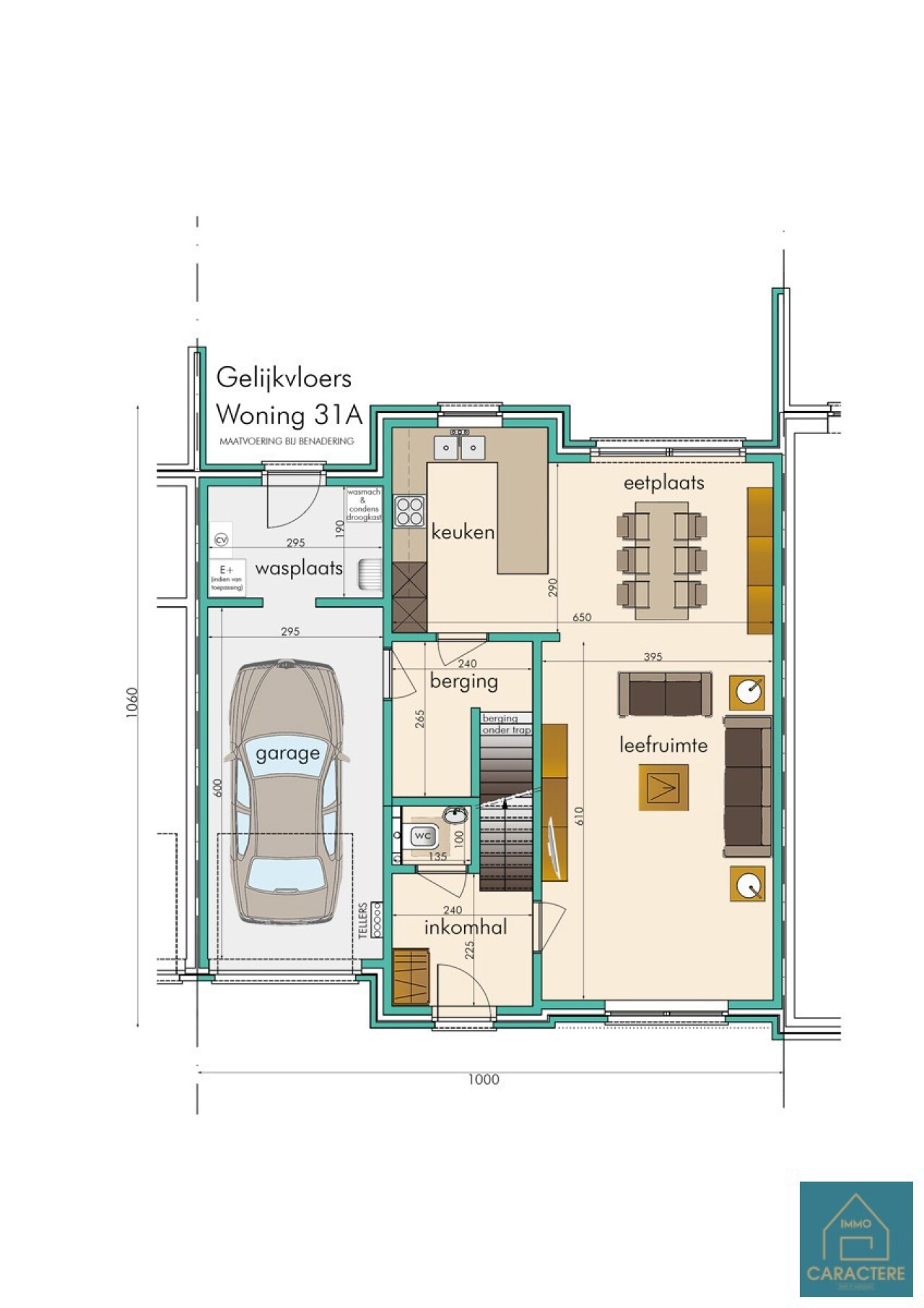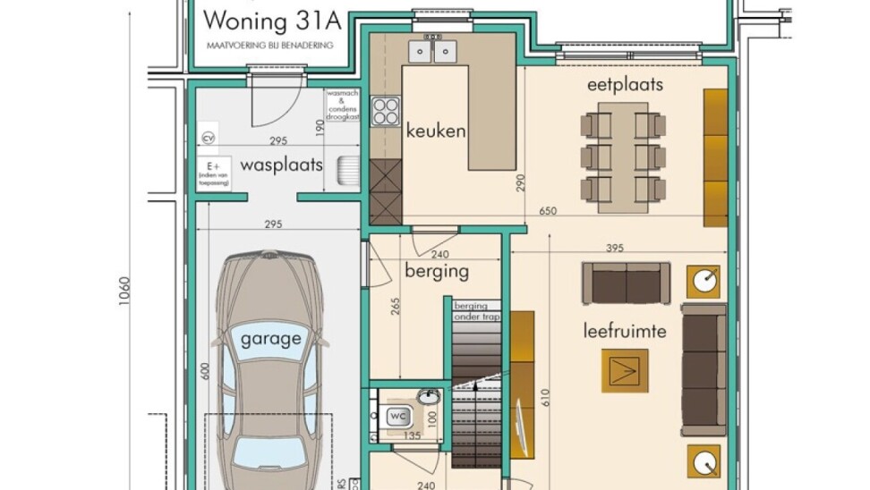 Vanuit de keuken is er toegang tot een praktische berging en een inpandige garage met wasplaats, die rechtstreeks uitgeeft op de tuin.