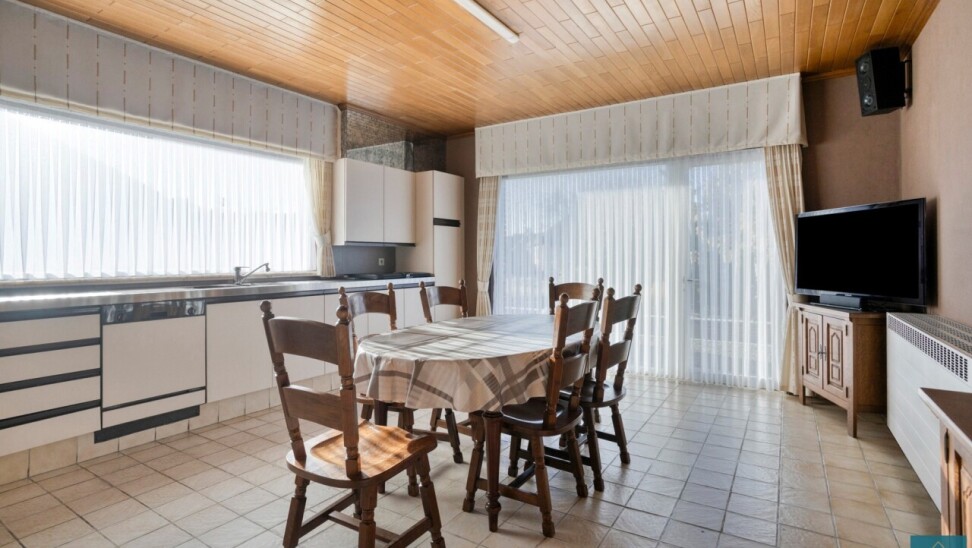 Gelijkvloers: inkomhal met toilet, lichtrijke living, keuken en eetplaats.